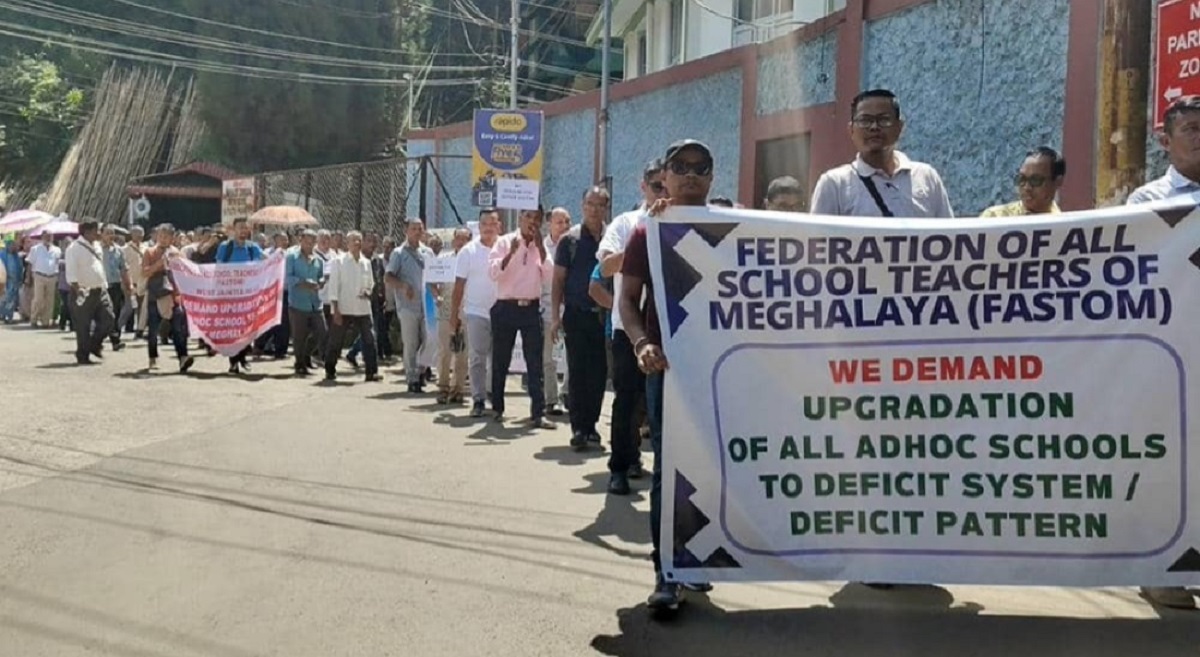 Deficit school teachers under the banner of the Khasi Jaintia Deficit School Teachers’ Association (KJDSTA) held a rally at Malki Ground, Shillong, on Monday and later marched to the Chief Minister’s Office at the Main Secretariat, demanding immediate enhancement of Dearness Allowance (DA) at par with government servants and release of long-pending arrears. Following the rally, the teachers submitted an urgent memorandum addressed to Chief Minister Conrad K. Sangma seeking enhancement of DA from the existing 43 per cent to 51 per cent, in line with prevailing rates applicable to government employees. According to the association, the delay in revising DA has caused severe financial hardship and mental distress to thousands of deficit teachers across the state.